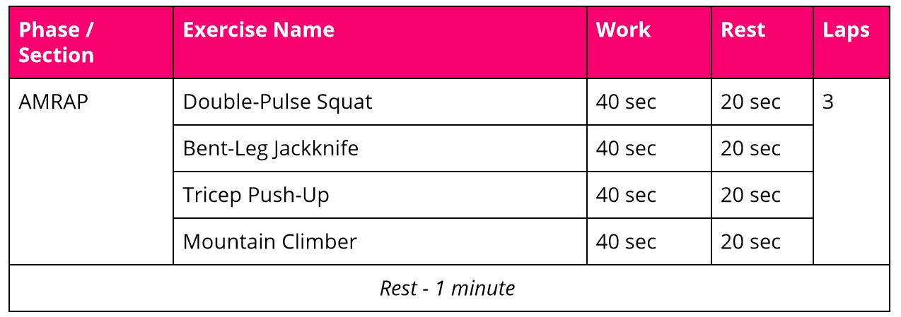 For this workout you’ll do three laps of three exercises with 40 seconds on and 20 seconds rest before moving onto the next exercise. Once the first lap has been completed rest 60 seconds. The total workout will take 20 minutes to complete!