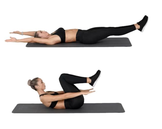 Step 3 – Exhale. Slowly lower your arms and extend your legs to return to the starting position, but without lowering your feet to the floor.